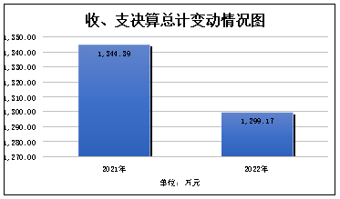 2022年度收、支总计1,299.17万元。与2021年相比,收、支总计各增加/减少-45.23万元,增长/下降-3.4%。主要变动原因是预算设备购置减少。