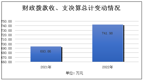 2022年财政拨款收、支总计741.98万元。与2021年相比,财政拨款收、支总计各增加/减少48.11万元,增长/下降6.9%。主要变动原因是编外人员收支进入财政拨款。